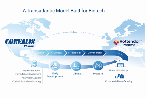 Corealis Pharma a conclu un partenariat stratégique avec Rottendorf Pharma, une CDMO de renommée internationale disposant de plusieurs décennies d’expertise en développement de phase avancée, en préparation réglementaire européenne et en fabrication commerciale de formes orales solides (OSD). Ensemble, nous proposons aux innovateurs en biotechnologie et en pharmaceutique un modèle intégré de bout en bout, du développement à la commercialisation, reliant le développement précoce et l’approvisionnement clinique en Amérique du Nord à la montée en échelle de phase III en Europe, au soutien à l’enregistrement des médicaments et à l’approvisionnement commercial à long terme.